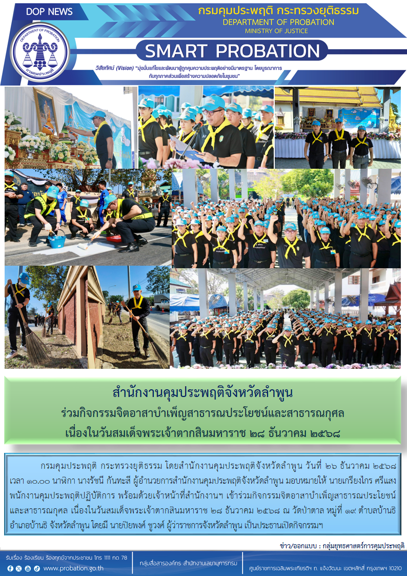 วันที่ 26 ธันวาคม ๒๕๖8 เวลา 10.00 นาฬิกา นางรัชนี กันทะสี ผู้อำนวยการสำนักงานคุมประพฤติจังหวัดลำพูน มอบหมายให้ นายเกรียงไกร ศรีแสง พนักงานคุมประพฤติปฏิบัติการ พร้อมด้วยเจ้าหน้าที่สำนักงานฯ เข้าร่วมกิจกรรมจิตอาสาบำเพ็ญสาธารณประโยชน์และสาธารณกุศล เนื่องในวันสมเด็จพระเจ้าตากสินมหาราช 28 ธันวาคม 2568 ณ วัดป่าตาล หมู่ที่ 19 ตำบลบ้านธิ อำเภอบ้านธิ จังหวัดลำพูน โดยมี นายปิยพงศ์ ชูวงศ์ ผู้ว่าราชการจังหวัดลำพูน เป็นประธานเปิดกิจกรรมฯ