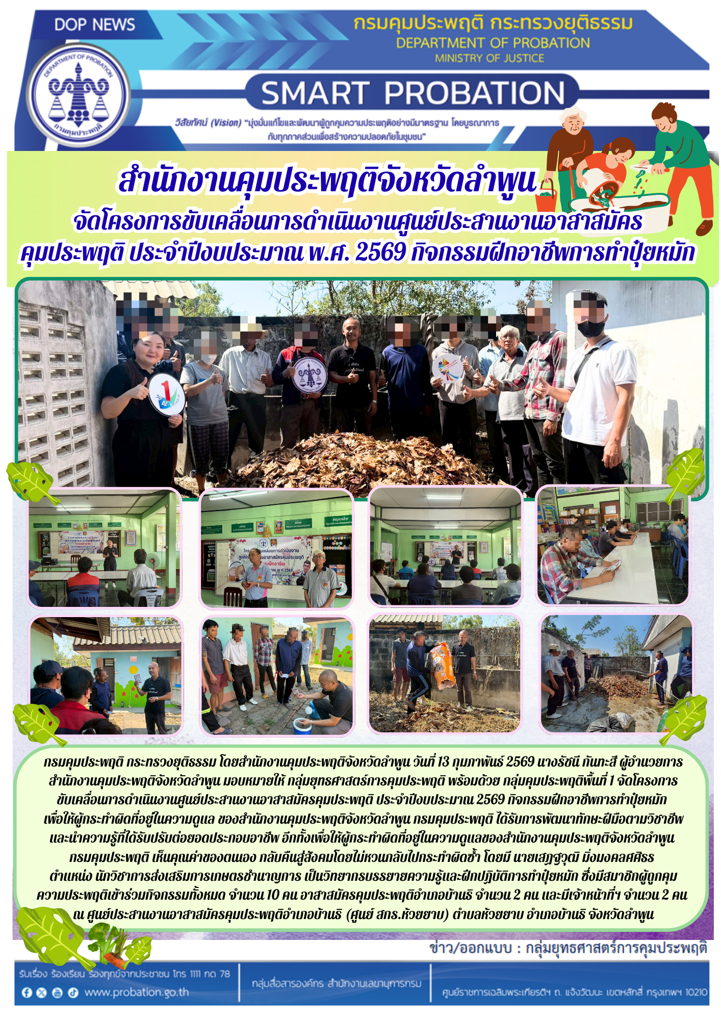 วันที่ 13 กุมภาพันธ์ 2569 นางรัชนี กันทะสี ผู้อำนวยการสำนักงานคุมประพฤติจังหวัดลำพูน มอบหมายให้ กลุ่มยุทธศาสตร์การคุมประพฤติ พร้อมด้วย กลุ่มคุมประพฤติพื้นที่ 1 จัดโครงการขับเคลื่อนการดำเนินงานศูนย์ประสานงานอาสาสมัครคุมประพฤติ ประจำปีงบประมาณ 2569 กิจกรรมฝึกอาชีพการทำปุ๋ยหมัก เพื่อให้ผู้กระทำผิดที่อยู่ในความดูแล ของสำนักงานคุมประพฤติจังหวัดลำพูน กรมคุมประพฤติ ได้รับการพัฒนาทักษะฝีมือตามวิชาชีพและนำความรู้ที่ได้รับปรับต่อยอดประกอบอาชีพ อีกทั้งเพื่อให้ผู้กระทำผิดที่อยู่ในความดูแลของสำนักงานคุมประพฤติจังหวัดลำพูน กรมคุมประพฤติ เห็นคุณค่าของตนเอง กลับคืนสู่สังคมโดยไม่หวนกลับไปกระทำผิดซ้ำ โดยมี นายเสฏฐวุฒิ มิ่งมงคลศศิธร ตำแหน่ง นักวิชาการส่งเสริมการเกษตรชำนาญการ เป็นวิทยากรบรรยายความรู้และฝึกปฏิบัติการทำปุ๋ยหมัก ซึ่งมีสมาชิกผู้ถูกคุมความประพฤติเข้าร่วมกิจกรรมทั้งหมด จำนวน 10 คน อาสาสมัครคุมประพฤติอำเภอบ้านธิ จำนวน 2 คน และมีเจ้าหน้าที่ฯ จำนวน 2 คน ณ ศูนย์ประสานงานอาสาสมัครคุมประพฤติอำเภอบ้านธิ (ศูนย์ สกร.ห้วยยาบ) ตำบลห้วยยาบ อำเภอบ้านธิ จังหวัดลำพูน