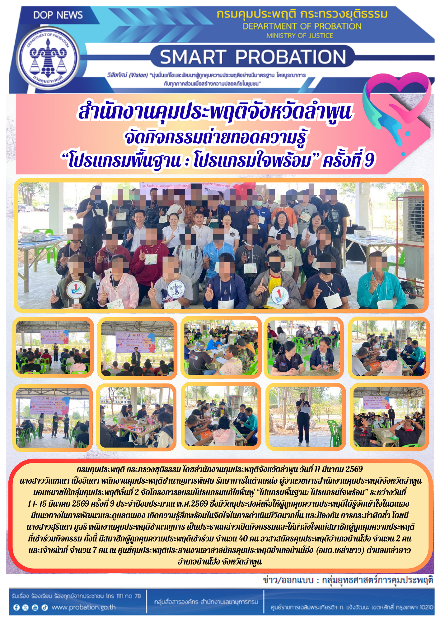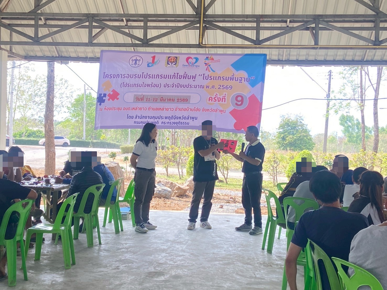วันที่ 11 มีนาคม 2569 นางสาววัณฑณา เป็งอินตา พนักงานคุมประพฤติชำนาญการพิเศษ รักษาการในตำแหน่ง ผู้อำนวยการสำนักงานคุมประพฤติจังหวัดลำพูน มอบหมายให้กลุ่มคุมประพฤติพื้นที่ 2 จัดโครงการอบรมโปรแกรมแก้ไขฟื้นฟู "โปแกรมพื้นฐาน: โปรแกรมใจพร้อม" ระหว่างวันที่ 11- 15 มีนาคม 2569 ครั้งที่ 9 ประจำปีงบประมาณ พ.ศ.2569 ซึ่งมีวัตถุประสงค์เพื่อให้ผู้ถูกคุมความประพฤติได้รู้จักเข้าใจในตนเอง มีแนวทางในการพัฒนาและดูแลตนเอง เกิดความรู้สึกพร้อมในจิตใจในการดำเนินชีวิตมากขึ้น และป้องกัน การกระทำผิดซ้ำ โดยมี นางสาวสุรินดา มูลธิ พนักงานคุมประพฤติชำนาญการ เป็นประธานกล่าวเปิดกิจกรรมและให้กำลังใจแก่สมาชิกผู้ถูกคุมความประพฤติ
